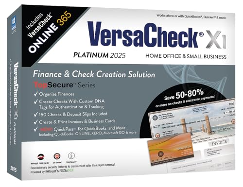 Brand: VersaCheck Manufacturer: VersaCheck Features Save 50-80% or more vs. Pre-Printed Mail Order Checks. Compatible with Windows 11, 10, 8, 7. Laser or inkjet printers supported by Windows. Create and Print DNA Secure business and personal checks using 30+ templates. Set Up Unlimited Accounts. Powerful Finance & Contact Manager. Works Stand-Alone or with Quicken, QuickBooks, [More]